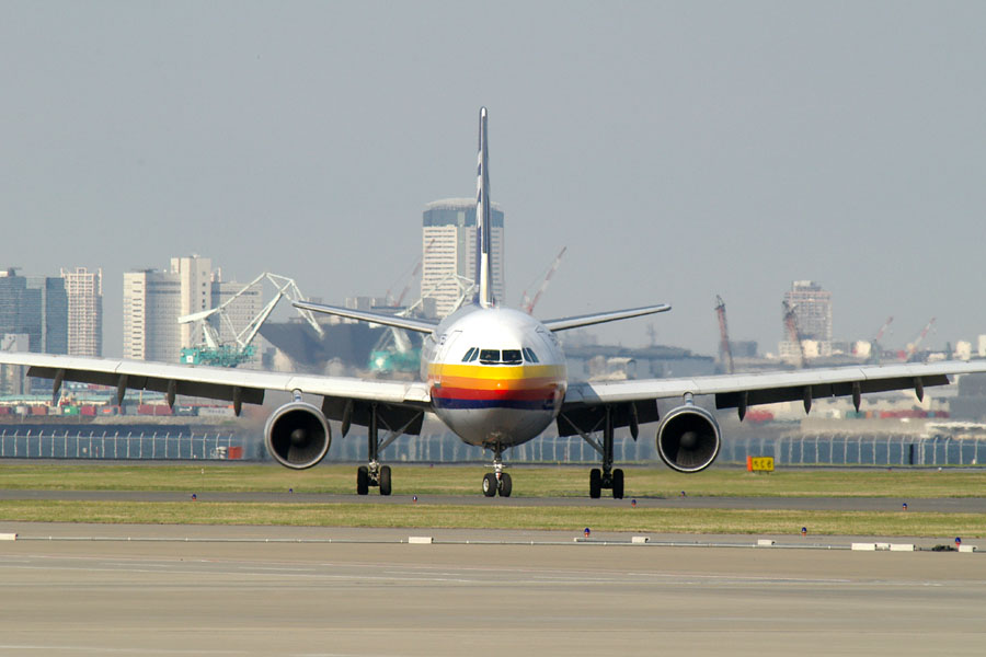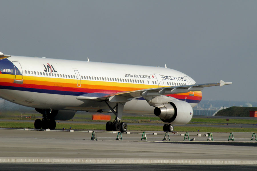 真正面のJAS A300-600R。着陸してきたところでフラップがまだ出ている。HP用に縮小してしまったのでこの写真ではわかりにくいが、機長とコパイが見える。 (羽田空港にて 2003.12.07) |