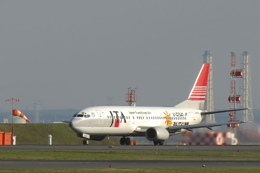 JTA B737-400 マンタくん。スロットル全開で離陸を開始するところ。エンジンの排気でILSアンテナの施設がぼやけている。いいなぁ、沖縄行きたいなぁ。 この写真、滑走路端をとらえているのでかなり遠く、結構厳しい写りだったのだが、デジタル処理をしたらすごくいい絵になった。*ist Dぐらいの画素数(3000x2000dot)ぐらいあるとデジタル処理でいろいろいじれる☆ (羽田空港にて 2003.12.07) |