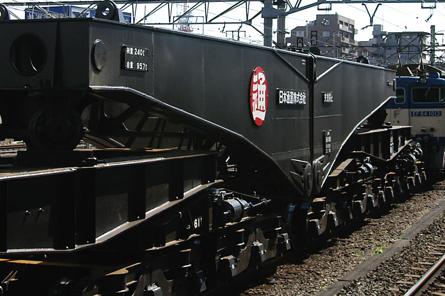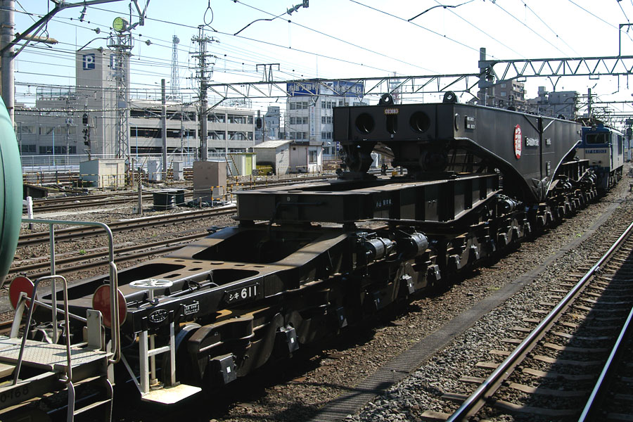 ![]() 出勤途中に巡り逢った超重量級の貨物車シキ611。自重95.7t、荷重240tの化け物車両だ。中央部の継ぎ目から二つに分離し、間に変圧器を挟み込むようにして積載する。 ものすごい車軸の数と黒い巨体!あふれる重量感!かっこよすぎる! (八王子駅にて 2004.04.05) |