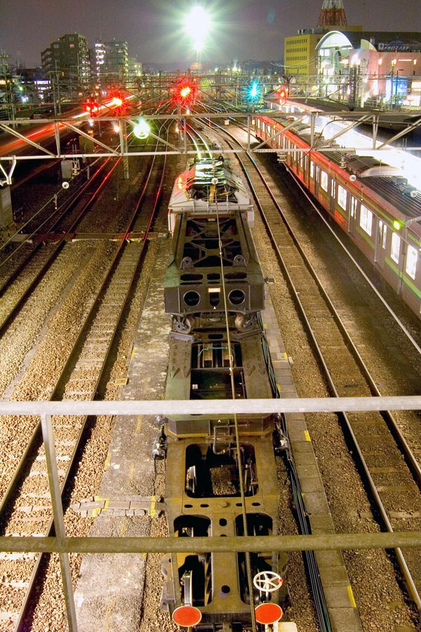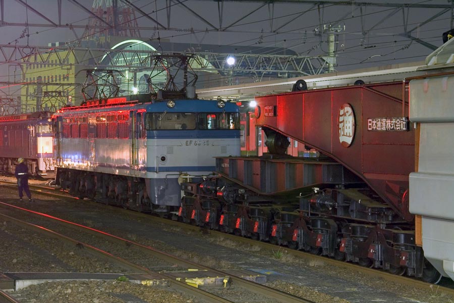 ![]() 出発間際のEF65 55とシキ611。中央線の下り最終列車の直前、2530頃に八王子駅を発車していった。この手の大型貨物はスピードが出せないために夜中にひっそりと移動する。 (八王子駅にて 2004.04.13) |