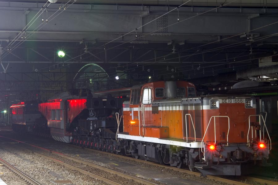 職場からいつものように帰宅する途中、何気なく窓の外を見たら巨大な黒い物体を発見! 4/5に見かけた超巨大貨物車両シキ611で、それが荷物を積んで戻ってきているではないか!!