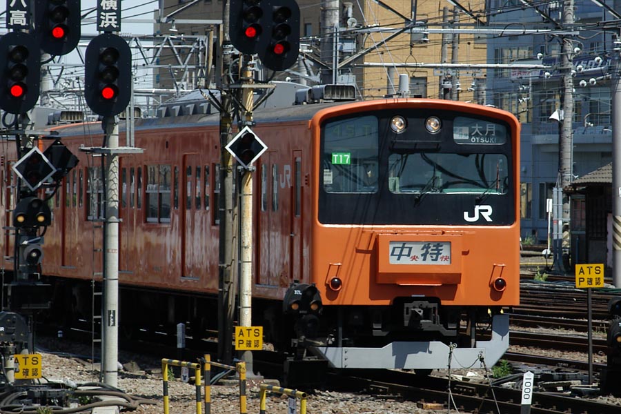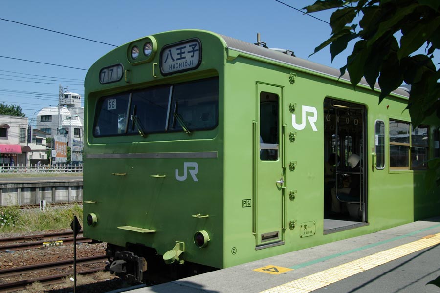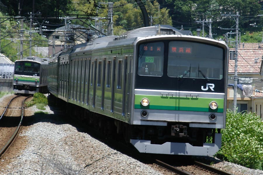 ![]() 横浜線の205系。写真の編成は横浜線で唯一行き先表示がLED表示のレア車両。奥に見える車両のように、普通は緑色のアナログ行き先表示である。最近は205系も結構かわいいかなと思うように…。通勤列車なので乗っててもつまらないけど(^^; (八王子みなみ野駅にて 2004.06.05) |