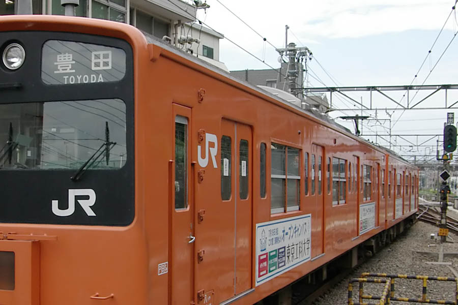 ![]() 某大学のオープンキャンパスの広告を貼り付けた中央線201系。以前MS Officeの広告を見たことがあるが、大学がこんなことをするのは初めてではないだろうか? 広告店のHPで調べてみたら中央線1編成(10両)1ヶ月で350万円ほどらしい。 ちなみに横浜線の205系にも車体広告Verが存在する。 (豊田駅にて 2004.06.23) |