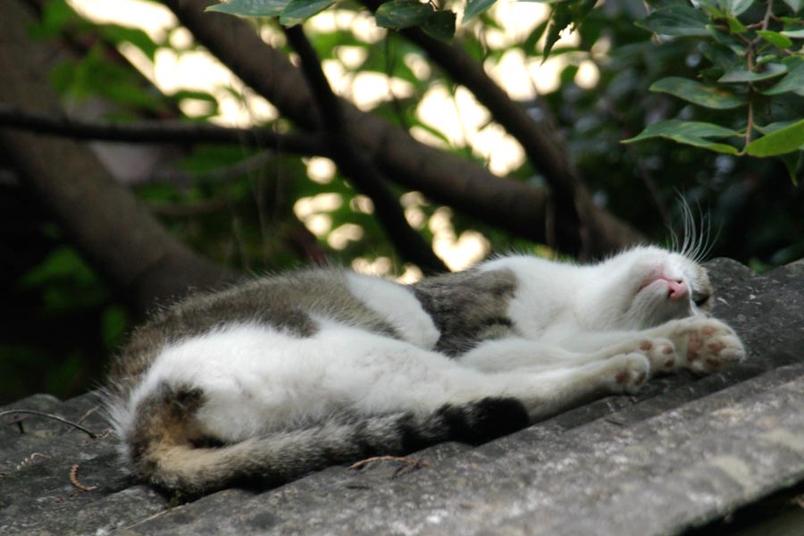 無防備ににくきうをさらして寝るノラ猫。首も変な方向に曲がっちゃっている(^^; 200mmで遠距離射撃した。しかし、さすがにノラ、近づいたらちゃんと起きて警戒態勢を取っていた。