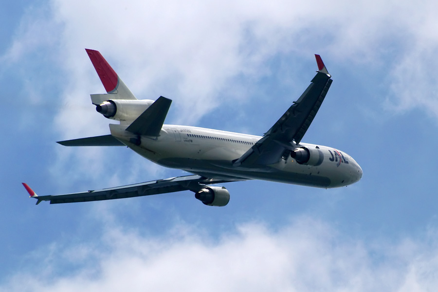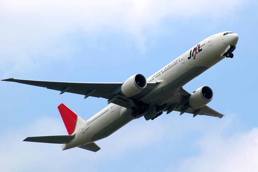 ![]() エールフランス機では切れてしまった右主翼が端まで写っているJALのB777-300ER(JA732J)。こちらではレイクドウィングチップの斜めっぷりが確認できるはず。この日はJALに導入されたばかりの300ERが2機とも写真に収まっていた。…撮ったときはただのB777-300だと思っていたわけだが(^^; (畑ポイントにて 2004.08.06) |
