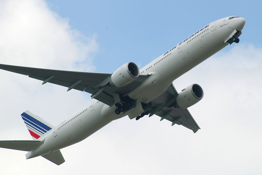 ![]() 某知人を乗せてパリに向けて飛び立つエールフランス機B777-300ER(F-GSQC)。この5月から導入されたちゃきちゃきの新型機。筆者はこの機のことを知らなかったので、「なーんだただのB777-300か」と思っていたのだが、実は新型らしい。特徴はでかいエンジンと主翼端の新形状レイクドウィングチップ。エンジンの大きさは写真を見てもよくわからないが、レイクドウィングチップは主翼端が後方に斜めにカットされているのがそれだ。びみょーに右羽根が切れてしまって申し訳ないが(^^; (畑ポイントにて 2004.08.06) |