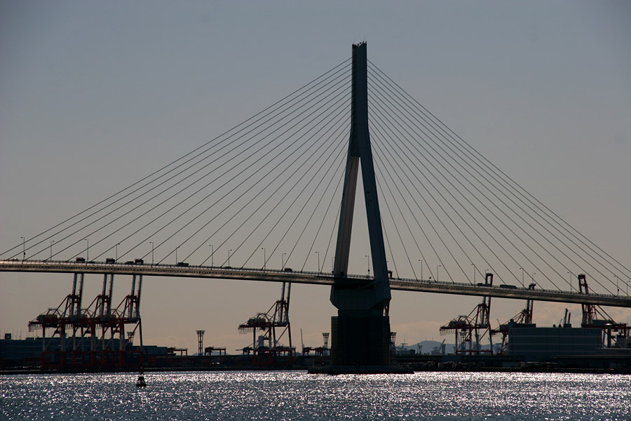 鶴見つばさ橋と林立する巨大クレーン。これのさらに右手奥にベイブリッヂが見える。