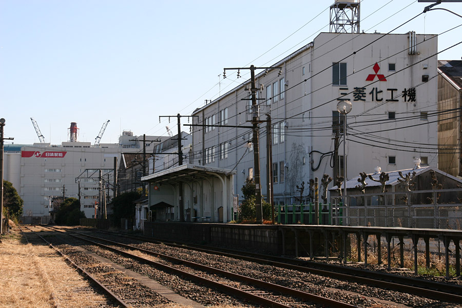 ともかく、この道は違うようだ。時間も体力もまだまだあったので、1200m先の行き止まりがどうなっているのか確かめたいという誘惑に思わず負けそうになったが、大川駅を見つけることが先決だったので、後ろ髪引かれつつ安善まで撤退。再度扇町方面へと歩を進めた。が、10分ぐらい歩いたら次の武蔵白石駅に到着。…分岐点通り過ぎちゃってるじゃん!(笑) この駅間は間違いなく線路を見ながら歩いてきたが、分岐点なんてなかったぞ? 試しに駅に入ってみる。と、駅の直前で一本支線が出ているじゃあありませんか。浅野の駅よりも駅の近くで分岐しているくせに、武蔵白石では支線の方に駅がない…。もう意味わからん(^^; これ以外に支線はなさそうだったので、この支線をたどってみることにした。線路の向こうに渡る場所が安善−武蔵白石間にはなかったので、武蔵白石駅を過ぎたところにある踏切を通って海側へ出る。線路はまっすぐに海の方へ向かっていた。さっきの行き止まり支線と似たような雰囲気だ。こっちも行き止まりという可能性も捨てきれないが、こちらは確かに鶴見方面から分岐できるし、分岐してる場所も路線図通りなので、ほぼ間違いないだろうという直感はあった。随分と歩かされたが、行き止まりの看板がなかったので信じて進む。と、支線の行き止まりが見え、かくしてそこに大川駅はあった。