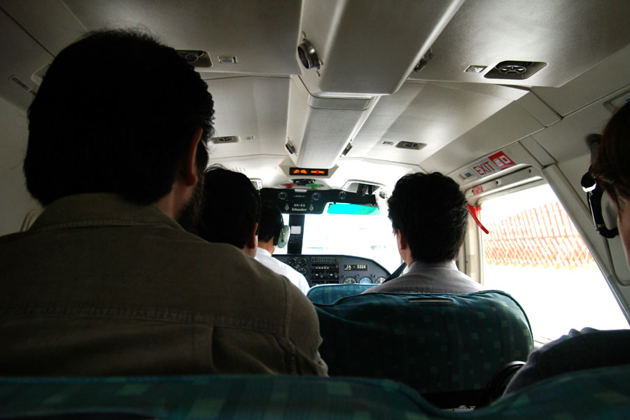アイランダーの機内。特に電子機器を使っちゃいけないと言われてないので撮影したのだが…。右の前にいるのがニロ、左は前からパイロット、わたりさん、阿瀬見。狭いので阿瀬見とかはつらそうだ。本当に車ぐらいの広さしかない!