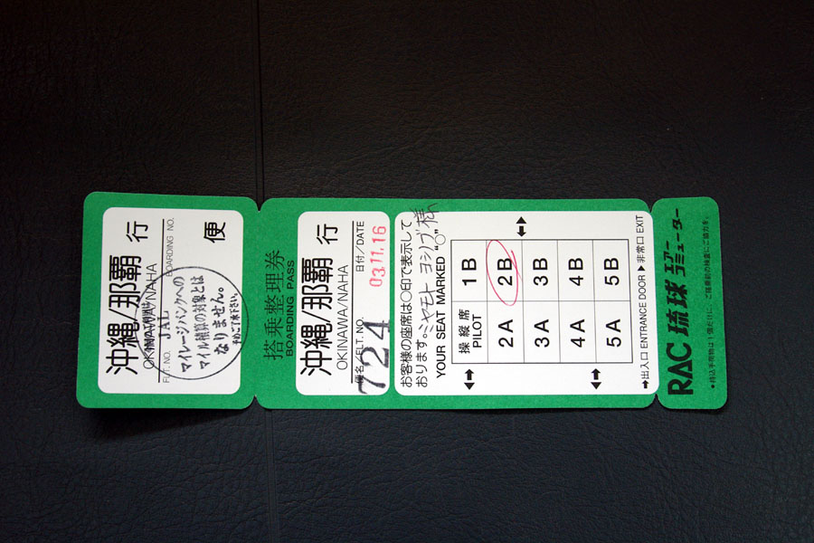 帰りの便、粟国島空港で発行された搭乗整理券。自分の席が○で示されている。もちろん、アイランダー専用だ!