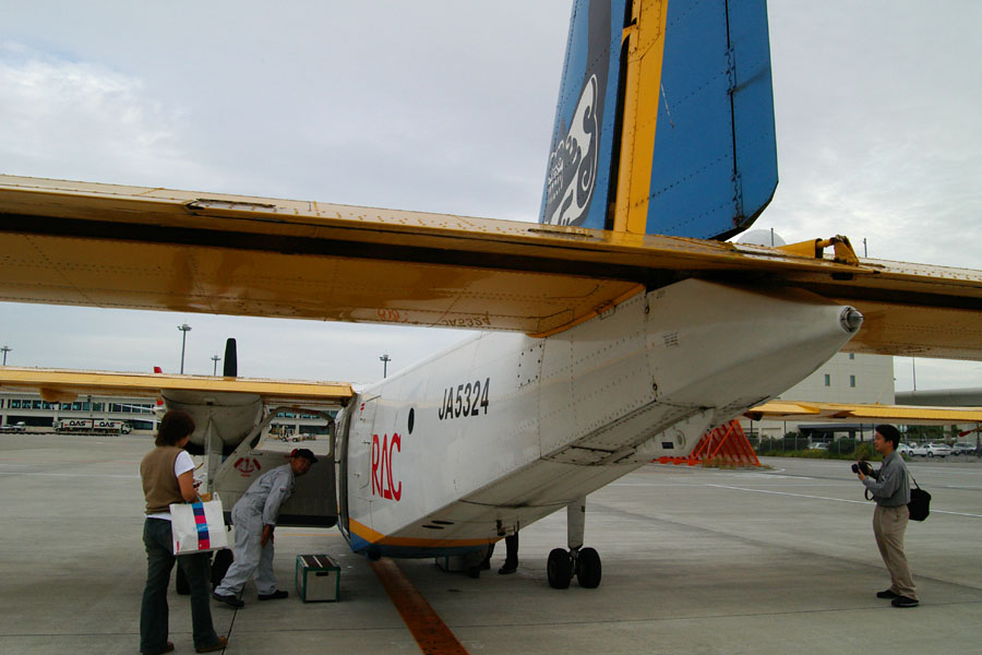 琉球エアコミュータ(RAC)のBN2 Isrander。RACのブルーとイエローのカラーリングはなかなか素敵だ。9人乗りの小型機で、なんと9人目は副操縦士の席に座れる(笑) 嬉しそうに写真を撮ってるニロ(右)と生活の足として利用している島民(左)。 (那覇空港にて 2003.11.16) |