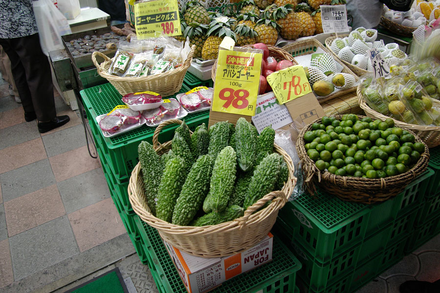 ゴーヤ、シークァーサーなど沖縄ならではの食材がならぶ店先。安いんだかどうだかさっぱりわからない(笑)