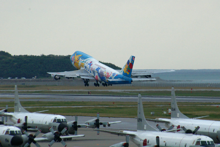おなじみANAのポケモンジェットB747-400。ピカチュウが自衛隊のP3Cの群れに手を振って離陸していく。