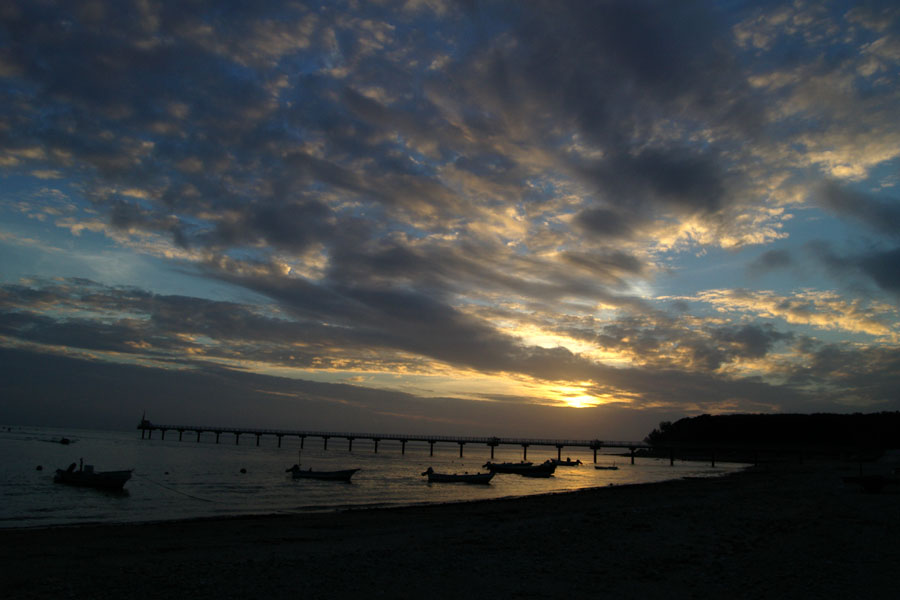 青空と夕焼けのコントラストが美しい、日没時の那覇空港の誘導灯。画面の真ん中にある橋みたいなのが誘導灯。