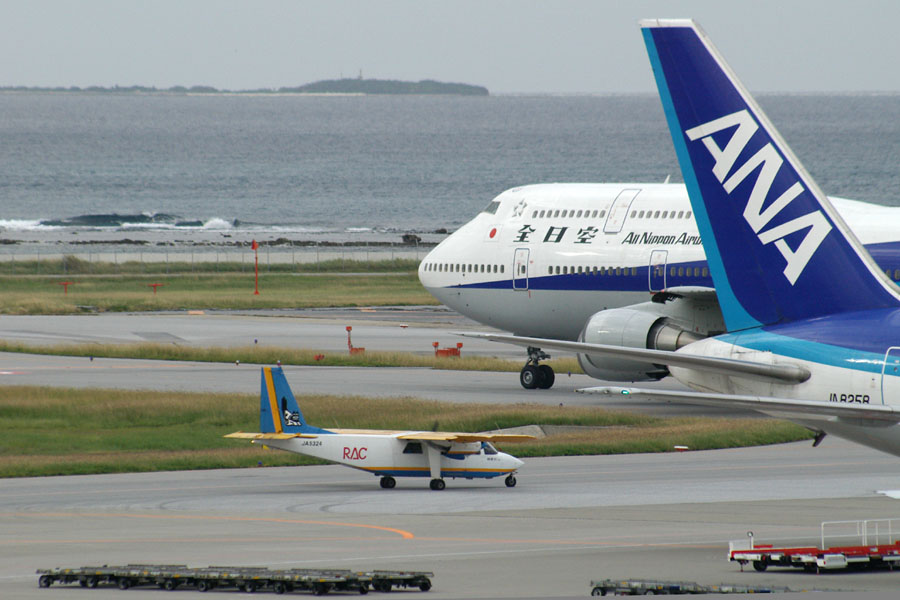 BN2(中央)とB747(奥)。この大きさの違い! BN2はパイロットを入れても10人乗りなので、びっしりとついているB747の窓ガラス約5つ分しかない。 (那覇空港にて 2003.11.14) |