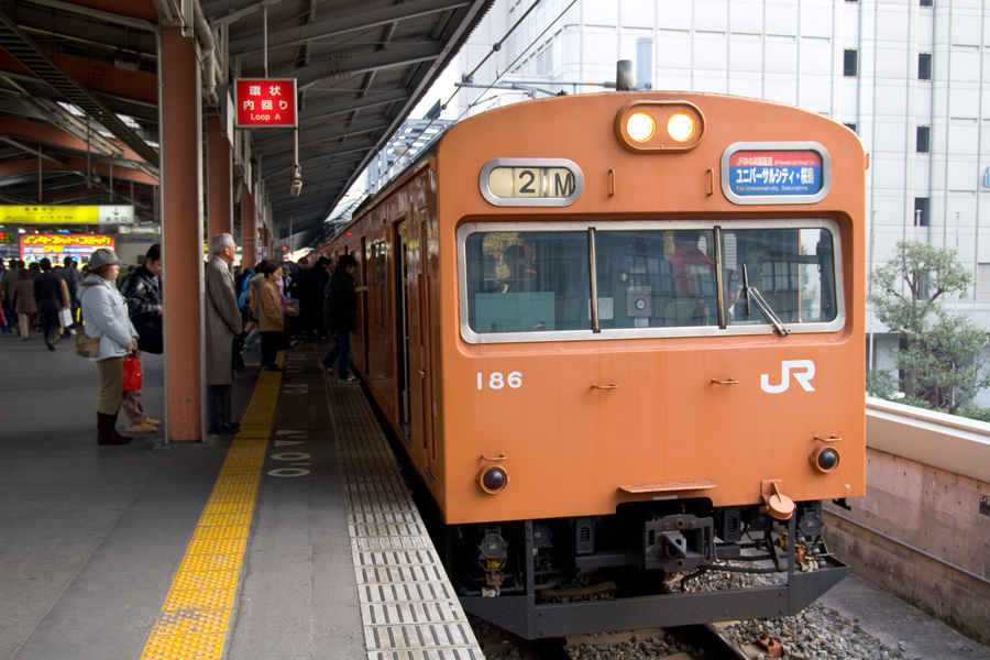 いつものように前置きが長くなってしまったが、いざ出発。横浜線の始発は0500ぐらいなので中央線は始発でなくともよいのだが、早めに準備が終わってしまったので、駅に行ってみたら始発に間に合ってしまった。夜明け前の八王子駅を撮影して暇を潰して横浜線の始発で新横浜へ。ここから500系ののぞみ1号で新大阪、JR京都線で大阪駅、隣接している梅田駅まで歩いて阪急電鉄宝塚線で伊丹空港にほど近い岡町という駅へ行く。途中、大阪駅で関東では絶滅しかけているのにこちらでは現役バリバリで活躍している103系を見たりしていたので、チャリを借りて空港に着くと1030になっていた。寄り道しなければもうちょっと早く着くだろうから、時間的にも飛行機と大差ないはずだ。