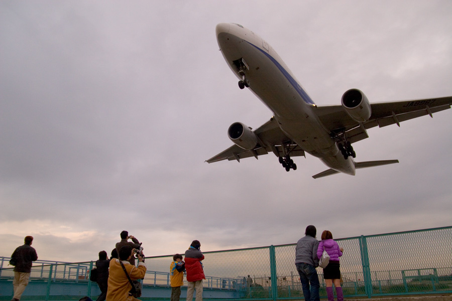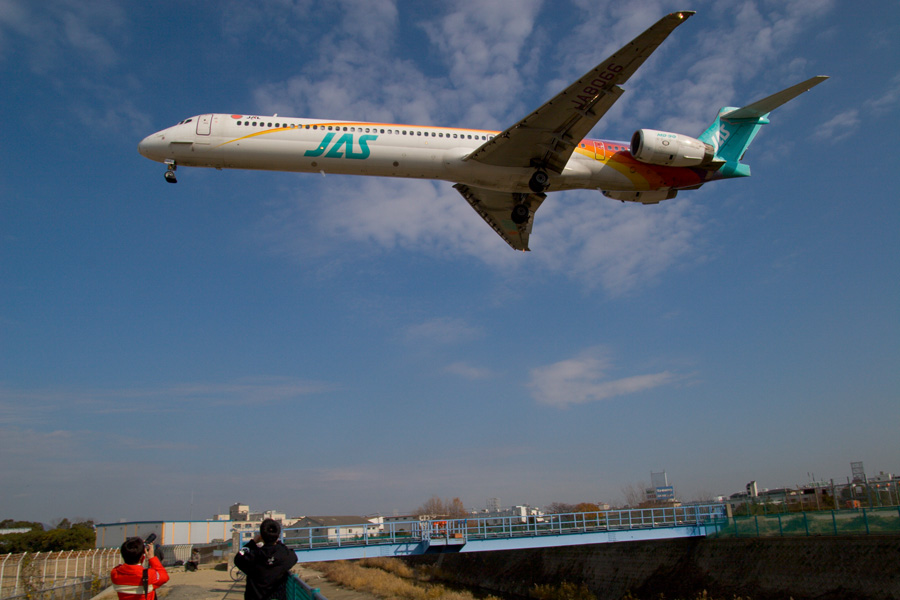昼頃にメシを食べるついでに他の場所からの眺めがどんなか、滑走路を一周してみた。軽く言っているが、10kmぐらいあるので、チャリじゃないとそんな無茶はできない(^^; 反対側の滑走路端からも撮影が可能だったので、風向きによってはあちらにまわることも可能だ。が、やっぱり千里川の土手が一番の撮影ポイントであることは間違いないようだ。なので、以後はずっと土手で撮影を行った。撮影はそれぞれの写真とコメントを見てもらえば雰囲気を感じ取ってもらえるんじゃないだろうか。